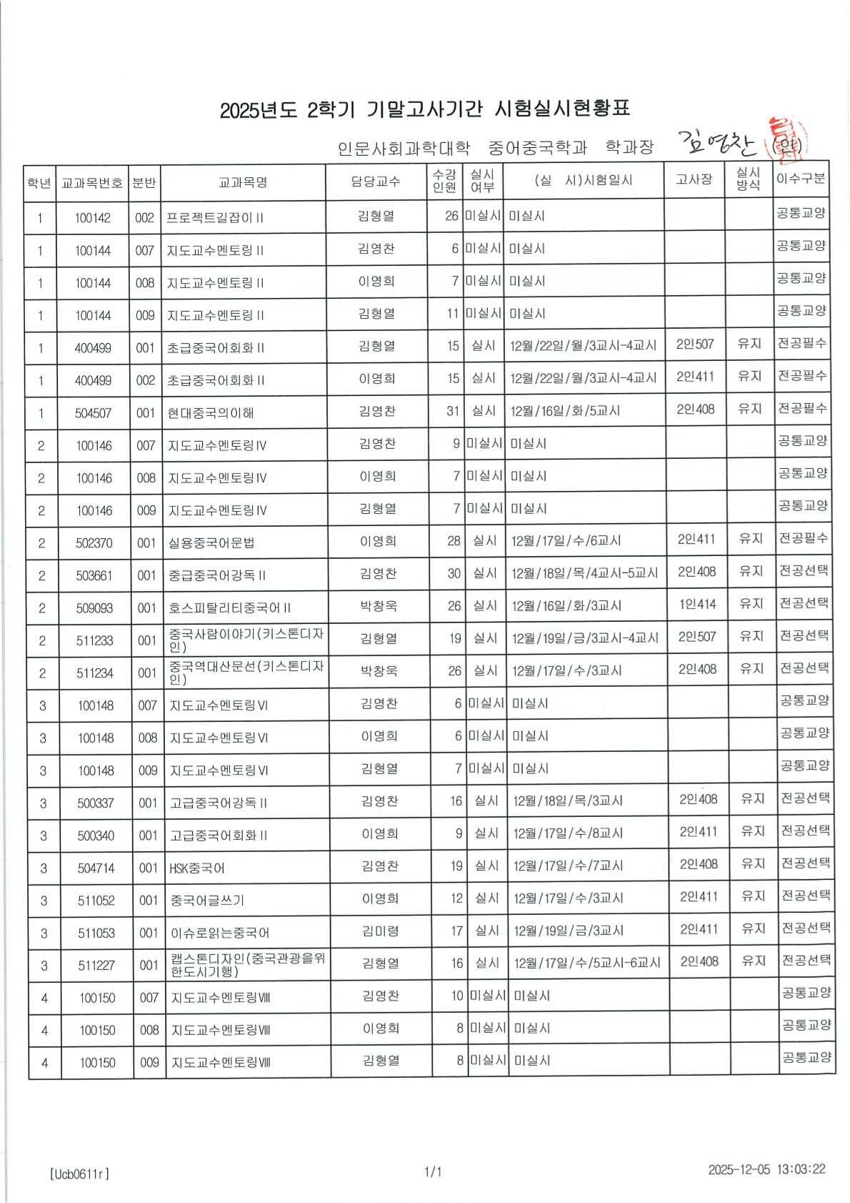 2025-2학기 중어중국학과 기말시험 시간표 공지