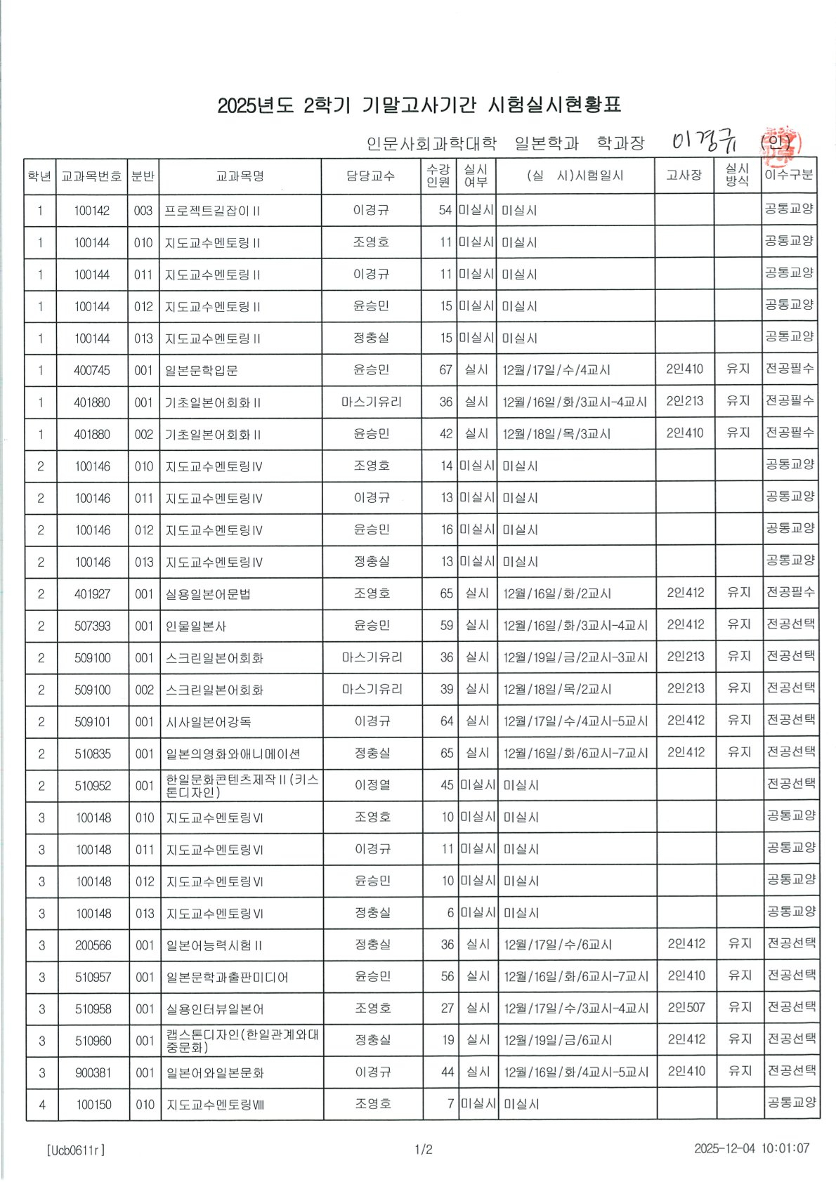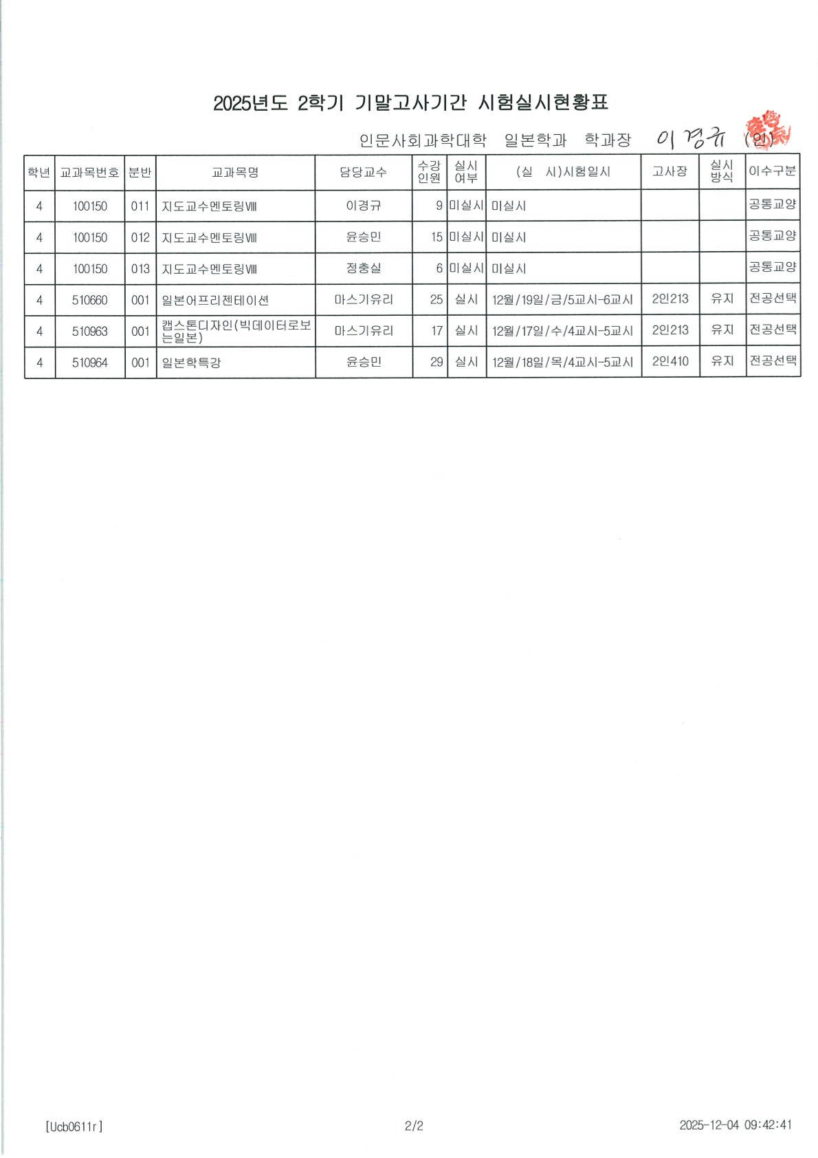 2025학년도 2학기 출석 및 공결 인정 신청 접수 및 처리 마감일자 안내