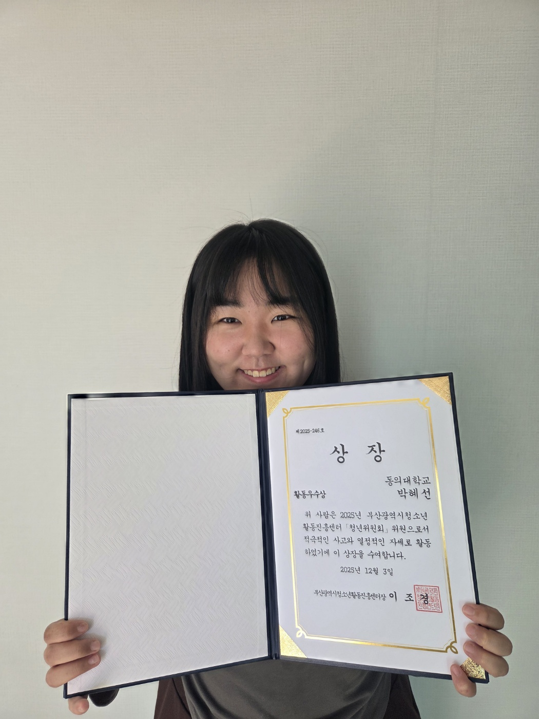 [2025]평생교육 청소년상담학과 박혜선 학생(23학번), 부산광역시 청년위원회 활동 우수상 수상