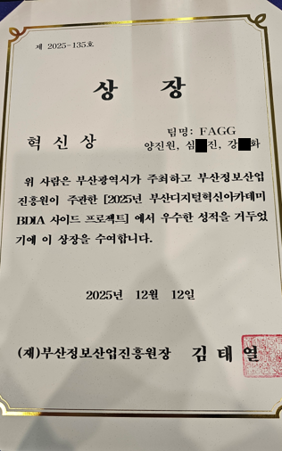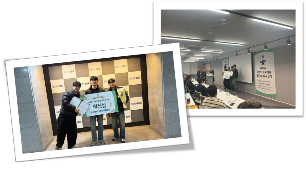 컴퓨터소프트웨어공학과 양○원, 심○진, 강○화 2025년 부산디지털혁신아카데미 BDIA 사이드 프로젝트 혁신상 수상